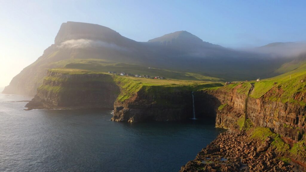 Gjógv, un village pittoresque sur la côte nord accidentée d’Eysturoy, est célèbre pour son port naturel unique niché dans un ravin formé par la mer. Ce ravin, qui a donné son nom au village et lui a permis de survivre jusqu’en 1960, offre un aperçu du mélange harmonieux de la nature et des traditions féroïennes. La charmante maison d’hôtes Gjáargarður invite les visiteurs à dîner dans son restaurant chaleureux, qui baigne dans l’ambiance sereine du village.